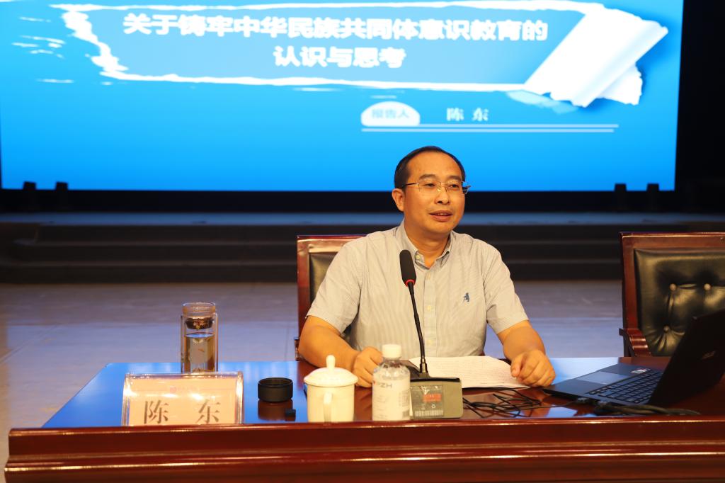 陈东以“关于铸牢中华民族共同体意识教育的认识与思考”为题,紧紧围绕什么是中华民族共同体意识、为何要铸牢中华民族共同体意识以及如何在新时代铸牢中华民族共同体意识三个方面,以翔实的史料、生动的案例和详细的数据,深刻阐释了铸牢中华民族共同体意识的时代意义与历史逻辑,系统解读了中华民族多元一体格局的形成与发展,精准指出了新时代民族工作的核心要义与实践要求。他指出,各民族共同开拓了祖国的辽阔疆域,共同缔造了统一的多民族国家,共同书写了辉煌的中国历史,共同创造了灿烂的中华文化,共同培育了伟大的民族精神,形成了“休戚与共、荣辱与共、生死与共、命运与共”的共同体理念。他强调,要正确把握共同性和差异性、中华民族共同体意识和各民族意识、中华文化和各民族文化、物质和精神四对关系,把铸牢中华民族共同体意识贯穿改革发展全过程,将个人理想、本民族发展与国家富强、民族复兴的伟大目标紧密结合起来,积极参与到促进各民族交往交流交融以及共同团结奋斗、共同繁荣发展的实践中去。
