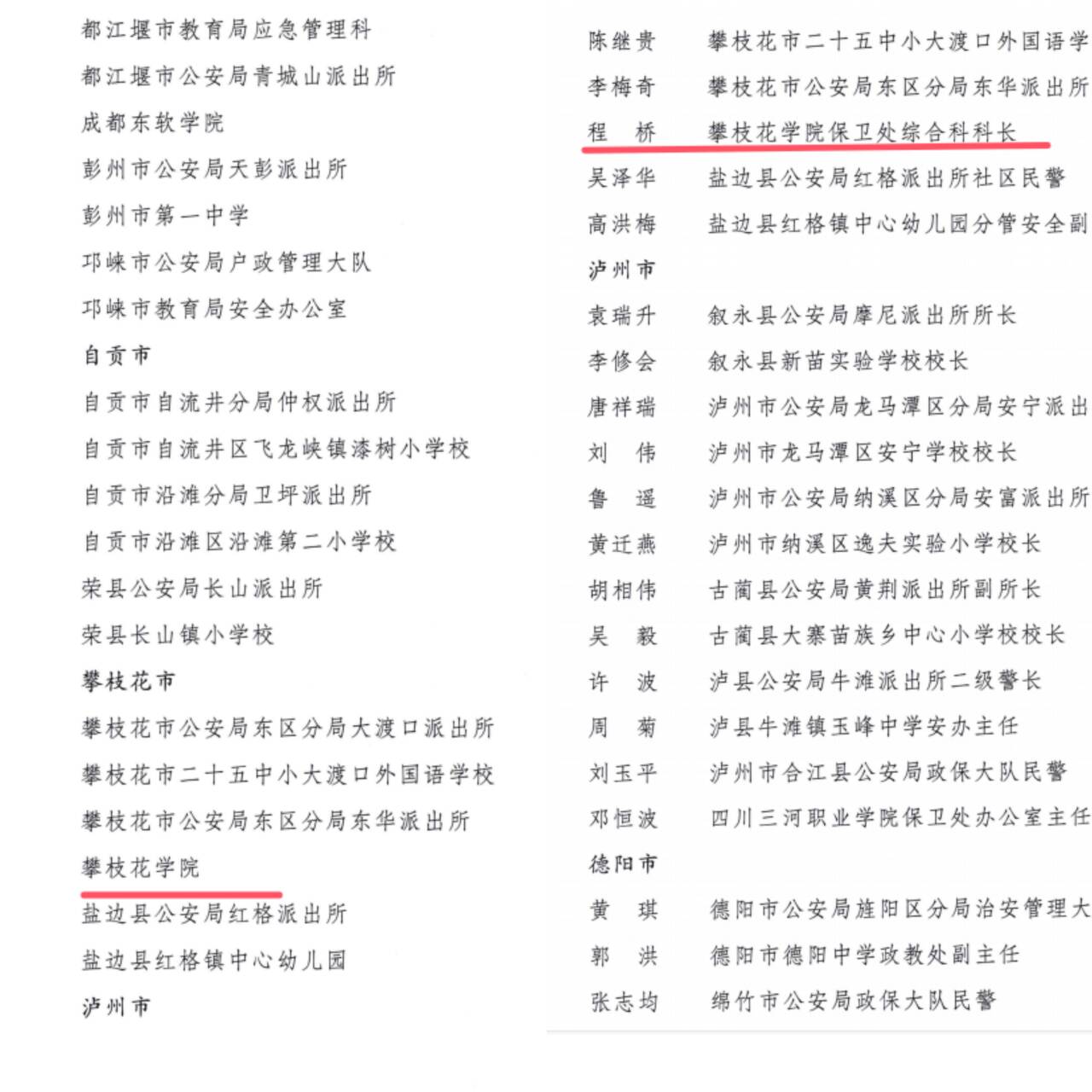近日,四川省公安厅、四川省教育厅联合下发《关于对2024年度全省“警校共育”工作成绩突出的集体和个人予以表扬的通报》,对在全省“警校共育”工作中作出突出贡献的集体和个人进行表彰。攀枝花学院被评为“成绩突出集体”,学校保卫处综合科科长程桥同志被评为“成绩突出个人”。