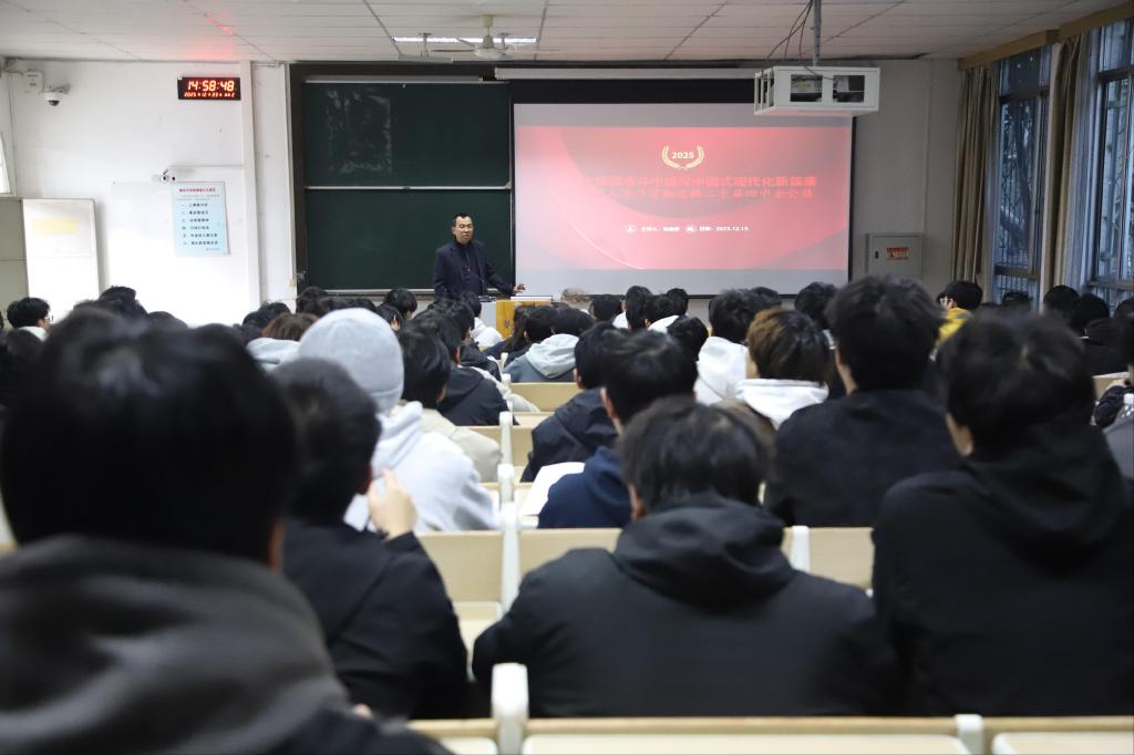 1223日下午,副校长张旭辉在志学楼1-102教室,以《在接续奋斗中谱写中国式现代化新篇章——深入学习贯彻党的二十届四中全会精神》为题,120余名学生和马克思主义学院教师讲授形势与政策课。