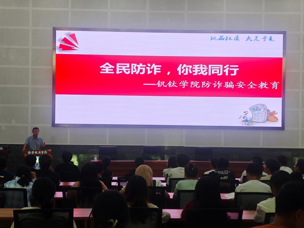 为切实提升全体师生的反诈防骗意识和自我保护能力,928日下午,钒钛学院于图书馆博雅厅,为2025级新生开展防诈骗安全教育专题活动,通过“宣讲+承诺+线上推广”三维联动为刚步入校园的新生筑牢“入学安全第一关”。钒钛学院党委副书记、纪委书记蒲洪,新生辅导员沙彩云以及2025级新生班干部及寝室长全员参会,共同学习反诈知识与应对技巧。